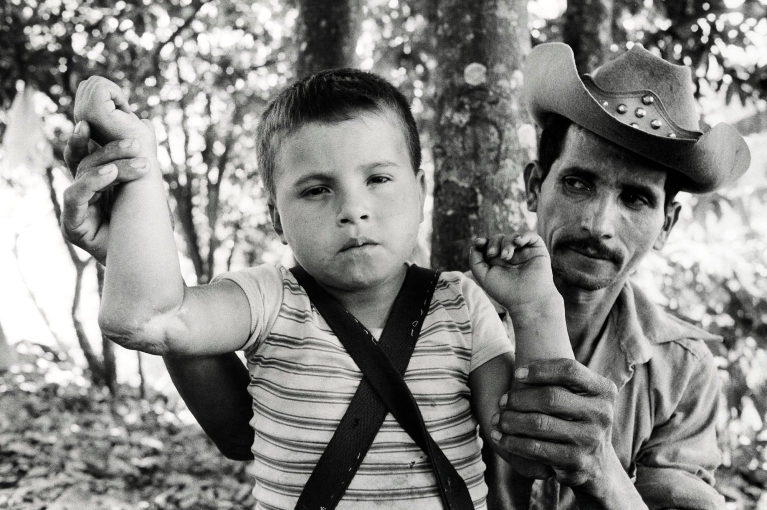 With colour, one practical issue was the narrow exposure latitude of colour transparency film – a quarter of a stop could make the difference between a perfectly exposed slide and one that was out. Along with others shooting transparency, I would carry an incident light meter in the top pocket of my camera vest and would take a quick reading before every colour exposure. In the early morning and late afternoon the tropical light of Central America can be magical. But after 9.30 am and up to about 3.30 pm the brightness of the light exceeds the two stops between highlight and shadow that transparency film can handle without using fill-in flash. Even used with great care, fill-in flash can have a certain look and in conflict zones it is not always appropriate. Trip a flash and you can risk attracting attention to yourself and others. Black and white film, however, has a seven stop exposure latitude so it’s possible to shoot through the day without that particular issue.