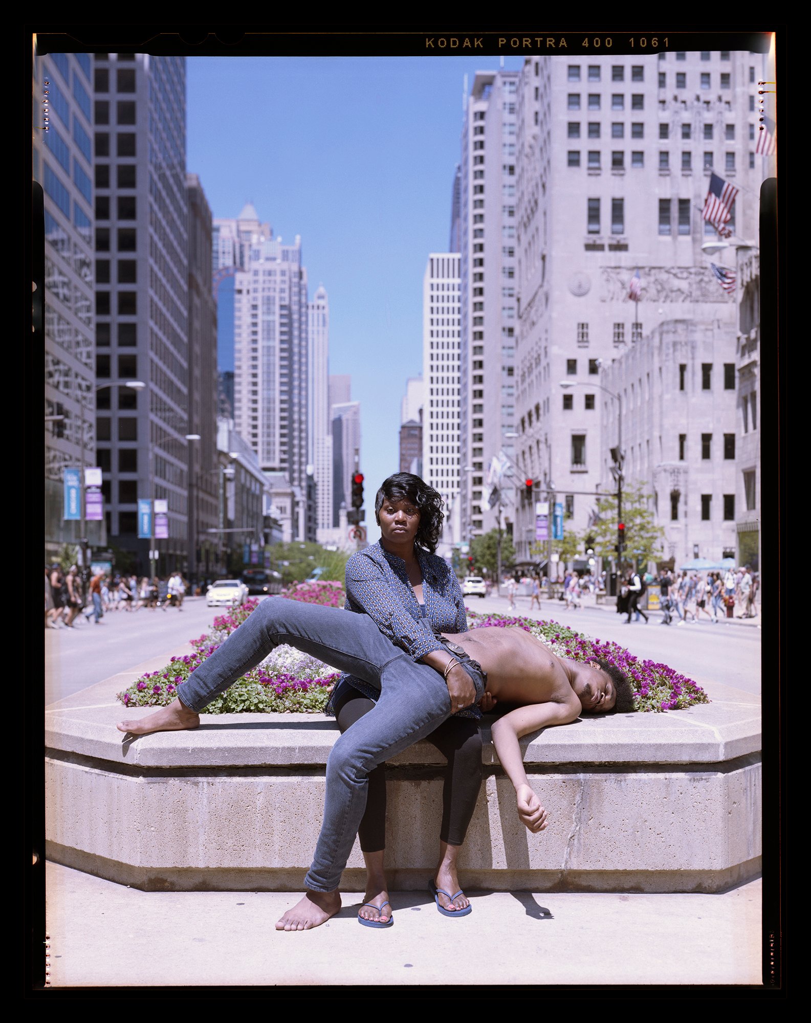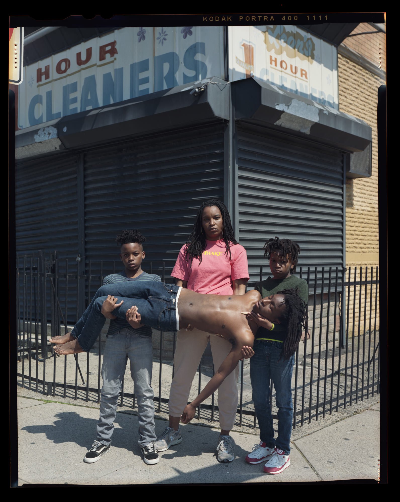 The interpretation of the classic Pietà; a son lay bare across the lap of his mother, a throat exposed, a real body with real skin, the gentle protective hand that rests on her sons shoulder, a family carrying the weight of loss. Created in a response to the senseless murders of black men across the nation by police violence, Jon Henry set out to photograph mothers with their sons in their environment, reenacting what it must feel like to endure this pain.